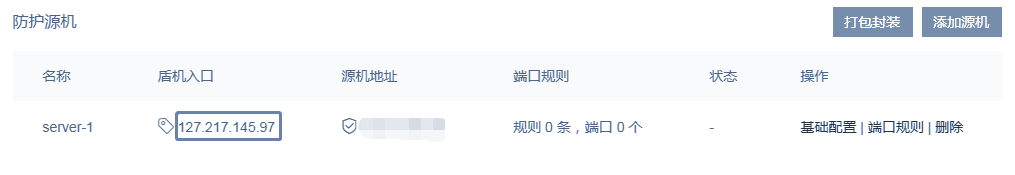 1. 在游戏盾后台的实例详情中,找到刚刚添加的“防护源机”,点击“端口规则”。